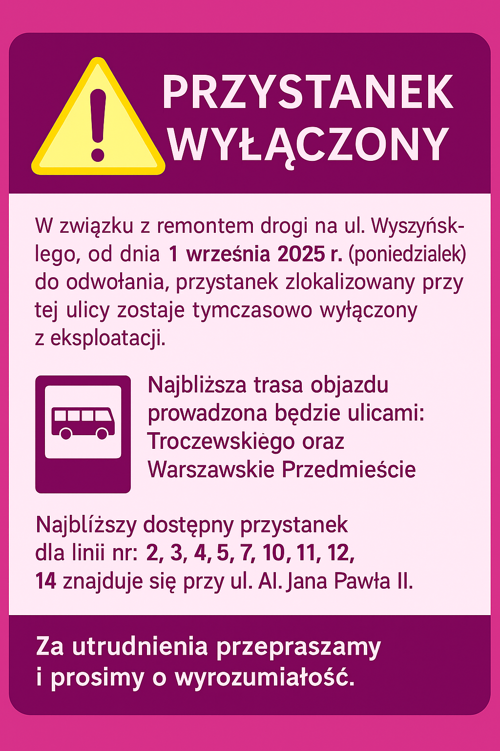 W związku z remontem drogi na ul. Wyszyńskiego, od dnia 1 września 2025 r. (poniedziałek) do odwołania, przystanek zlokalizowany przy tej ulicy zostaje tymczasowo wyłączony z eksploatacji.